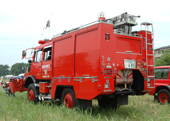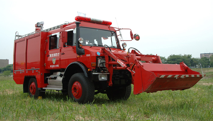ウニモグをベースに、震災時には瓦礫等の障害物を除去するための油圧式フロントローダーを装備した車両です。通常のポンプ車と同様、輅車昇降装置、三連梯子昇降装置、吸管自動巻取装置等の省力化装置も装備しています。二台が製作され、平常時はフロントローダーを外し、通常の災害にも出場していましたが、車両の操縦性、乗降性の悪さのためか、現在は震災時専用車両となっているようです。