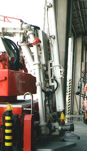 この車両はA−1級のポンプの他に真ん中の丸いタンクに宮田工業製の粉末消火剤タンク(粉末消火器と中身は同じです)を備えています。ロングシャーシを使用し、ブームがキャブ上部に来ないような艤装をしています。おそらく、車庫が低いか、発電所内で配管等により、車高の高い車両が通行できない所がある為、このような艤装になったと思われます。