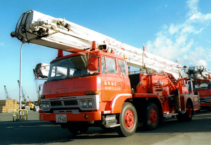 八戸地域広域市町村圏事務組合消防本部八戸消防署河原木分遣所配備 シャーシ:日野TC343改 ポンプ:A-1級(ME-7) ブーム:3節23m(MQ-20A) 製作:1977年 森田ポンプ